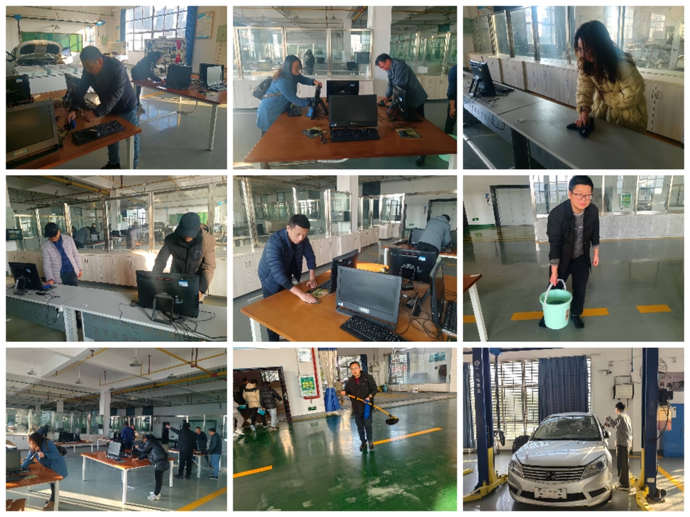 经过半天的辛勤努力,汽车实训楼焕然一新。地面干净整洁,设备摆放有序,教学设备也整理得井井有条。
