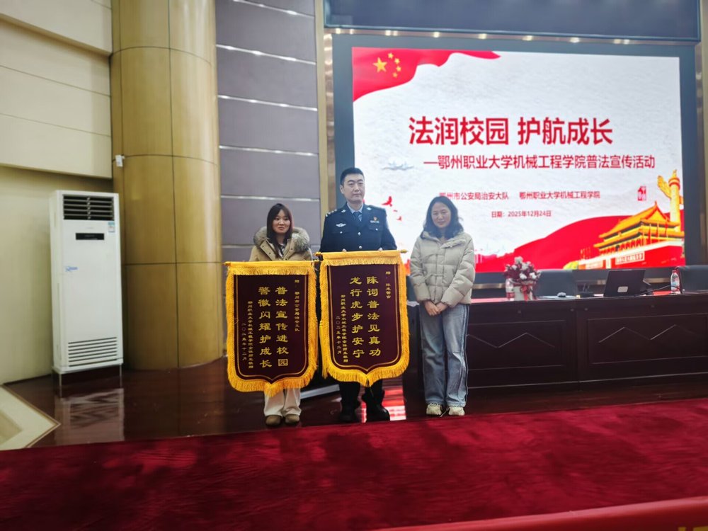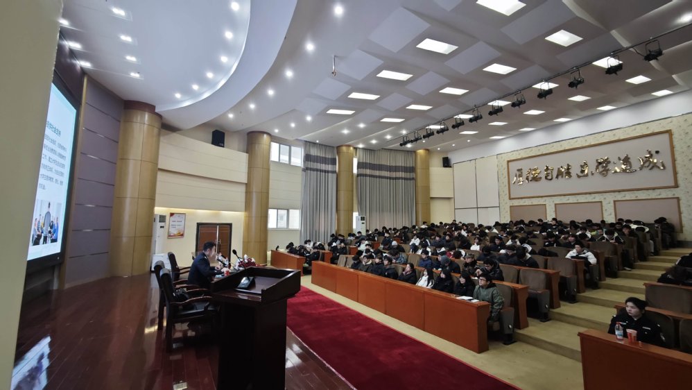 (通讯员 周艳艳)冬日暖阳洒满校园,法治清风浸润人心。为切实提升师生法治素养与安全防范能力,筑牢校园安全防护网,12月24日,鄂州职业大学机械工程学院特邀市公安局治安支队治安管理大队副大队长陈龙警官,在五号楼学术报告厅开展法律知识专题讲座。学院200余名师生齐聚一堂,沉浸式学习治安管理与反诈实用知识,在互动交流中感受法律威严,筑牢安全防线。