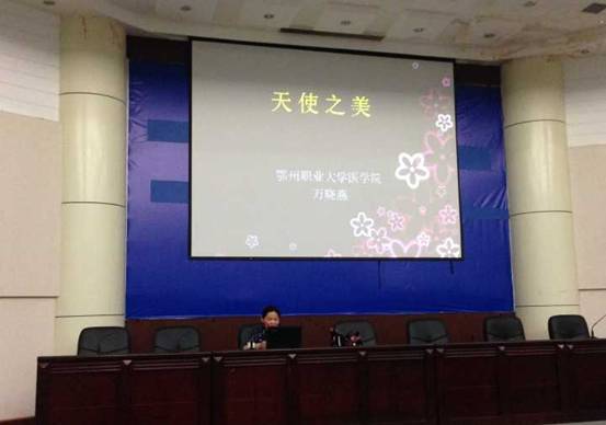 万晓燕教授首先纵向回顾了护理专业的创始人-----南丁格尔被称为“提灯天使”的由来,横向比较了警花之美、空姐之美、护士之美,并写了一首小诗赞扬了护士之美:护士是没有翅膀的天使!然后详细讲解了护士仪表美、护士行为美、护士心灵美、护士技艺美,并指出一些影响护士美的不良习惯,要求护生对照自己,有则改之无则加勉。在讲座过程中,同学们聚精会神的聆听,时而积极互动,现场气氛浓郁、愉快,培养了护理专业学生准确的审美鉴赏力,激发了护理专业学生对护士专业的向往与热爱,强化了专业认知,对提升专业素养起到了积极的促进作用,达到了良好的预期效果。最后,万晓燕教授对护理专业学生提出了较高要求和寄予厚望,同学们也表示要能力学习专业知识,不断提高专业素质,将来成为一名优秀的白衣天使!讲座在一片热烈的掌声中结束。