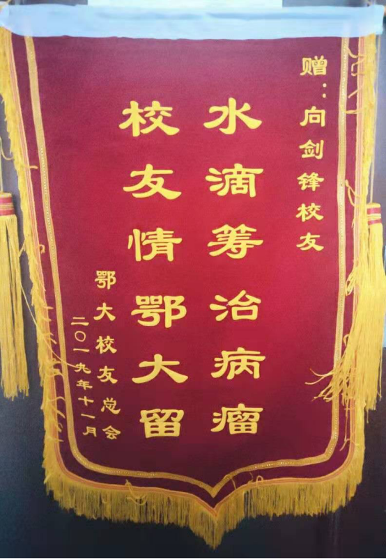 服装与艺术学院师生、邓学专及母亲,对上述捐款校友及老师表示衷心感谢和崇高敬意。校友办还专门为向剑锋回赠一面“水滴筹,治病瘤,校友情,鄂大留”的锦旗,以资鼓励。