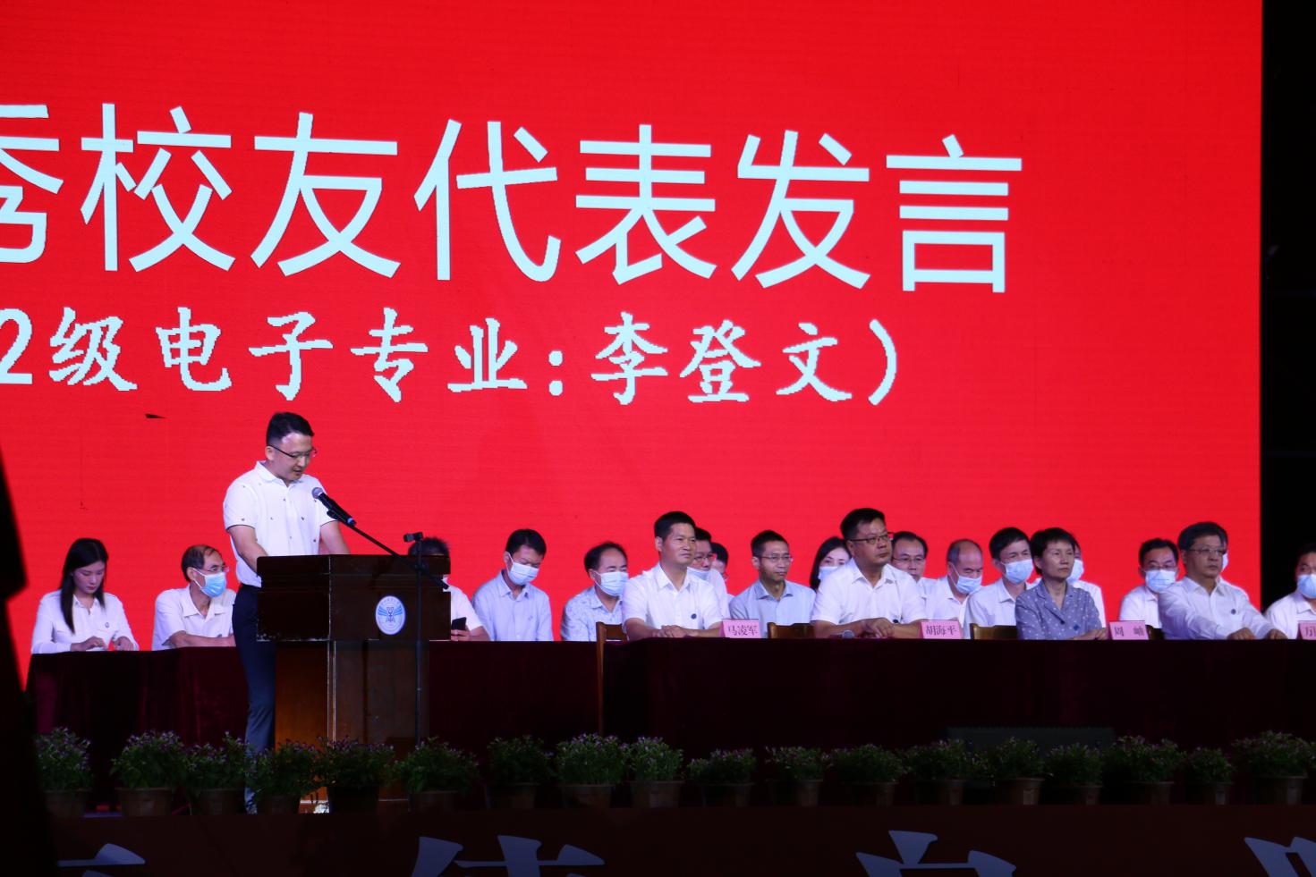 在开学典礼仪式上,知名校友代表92电子李登文深情介绍了自己毕业25年来的就业、创业经历,表达了对母校培育之恩的深深感谢和以母校为荣的深厚情感,并鼓励全体新生努力拼搏,不断前行。主持人副校长胡海平,希望新同学向知名校友学习,在大学期间健康生活,快乐学习,厚积薄发,将来在更大的舞台上收获成功、收获希望,成为家庭的榜样、学校的榜样、社会的榜样!