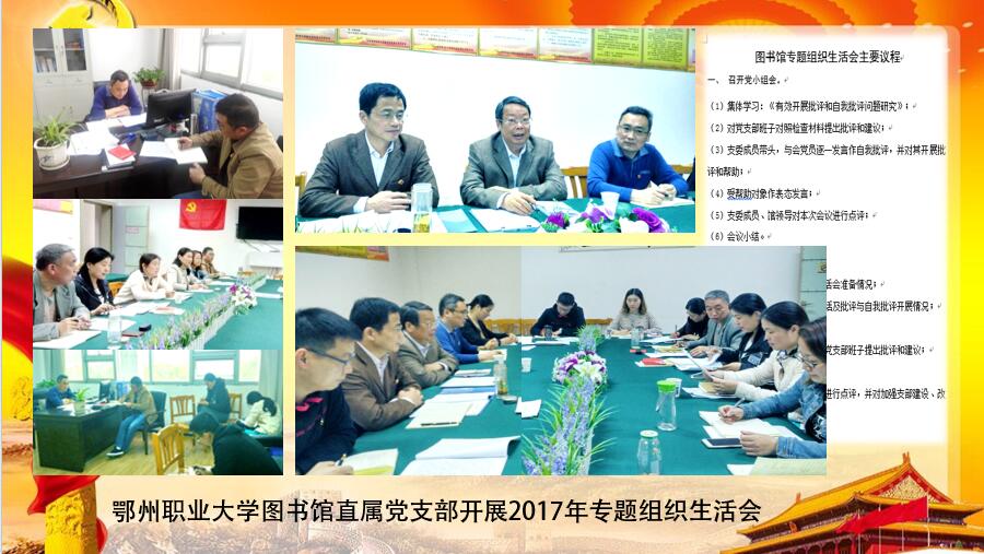 3月30日下午,我馆在图书馆四楼党员活动室召开2017年度基层党组织组织生活会,主管校长杨殿生作为上级党组织代表对会议情况进行点评,并对加强支部建设、作风建设提出要求。