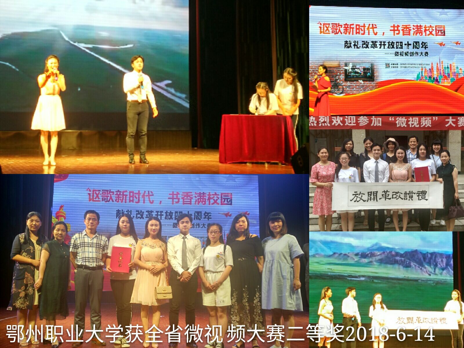 6月14日,由湖北省高等学校图书情报工作委员会高职高专分委员会主办的湖北省职教院校首届“讴歌新时代,书香满校园,献礼改革开放四十周年”为主题的微视频创作大赛决赛在武汉职业技术学院举行。我校选手《礼赞改革开放》经过激烈角逐,从44个参赛队中脱颖而出进入前八名,最终荣获二等奖的好成绩。