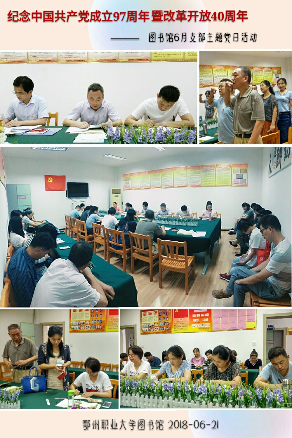 根据学校统一安排,图书馆于2018年6月21日召开了主题为“庆祝中国共产党成立97周年暨改革开放40周年”的支部主题党日活动。全体党员佩戴党员徽章,着正装出席,活动由宋其湖同志主持。