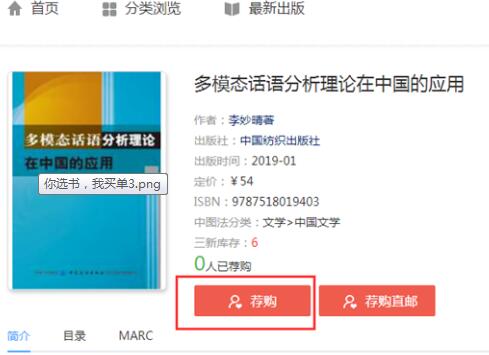 3.登录后在系统里搜索选中自己喜欢的图书,点击荐购即可。