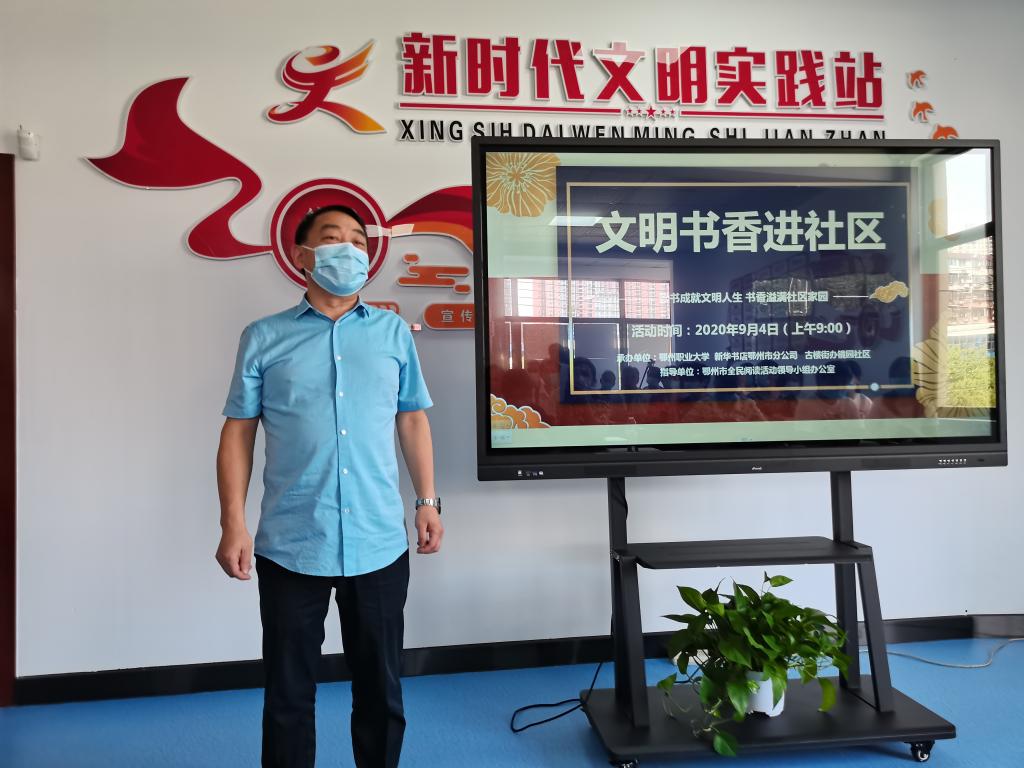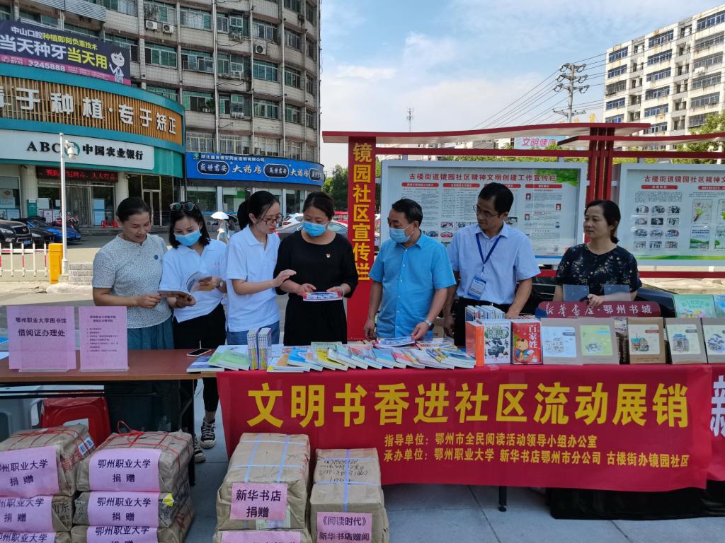 为了响应国家全民阅读相关倡议,推进文明和谐社区创建和书香社会建设,丰富社区居民精神文化生活,培育践行社会主义核心价值观,鄂州市全阅办、鄂州职业大学、湖北省新华书店鄂州分公司于9月4日在古楼街办镜园社区,联合开展了“文明书香进社区”活动。镜园社区联系领导、卾州职业大学校长周峰莅临现场并致辞,卾州职业大学图书馆馆长宋其湖、直属党支部副书记杜利、馆办公室主任鄢宁,湖北省新华书店鄂州分公司副总经理方学恩、店长曹俊青,镜园社区党委书记黄利平等出席本次活动。