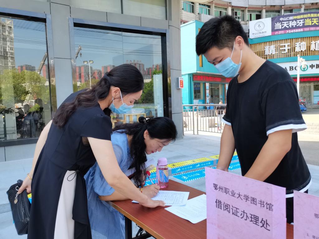 早上八点半,镜园社区门前广场上人头攒动,卾州职业大学图书馆和鄂州新华书店联合,对社区居民开展了免费办理图书借阅证、时尚图书流动展销及优惠售卖等活动,前来咨询和办理业务的居民络绎不绝。