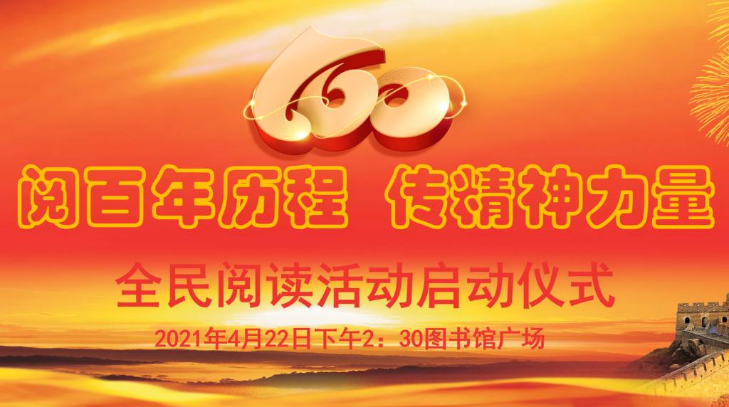 2021年中国共产党将迎来百岁华诞,4月23日是第26个世界读书日。为庆祝建党100周年,重温党的光辉历程,传承红色精神,增强开拓前行的勇气和力量,定于4月22日下午2:30在我校图书馆广场举办“阅百年历程 传精神力量”为主题的全民阅读活动启动仪式,开启新时代全民阅读新风尚。