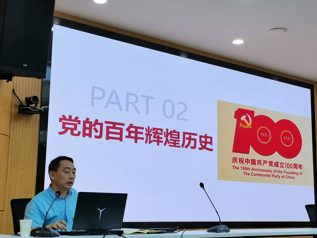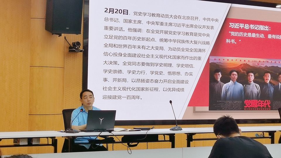 周峰同志从十八大以后习近平总书记关于党史学习方面的历次重要讲话入手为大家介绍了“为什么学党史”;从新民主主义革命时期、社会主义革命和建设时期、改革开放和社会主义现代化建设新时期、中国特色社会主义新时代四个阶段讲述了中国共产党人救国、兴国、富国、强国的“党的百年光辉历史”。并结合我校发展情况介绍了学习“百年党史的深刻启示”三个方面内容。