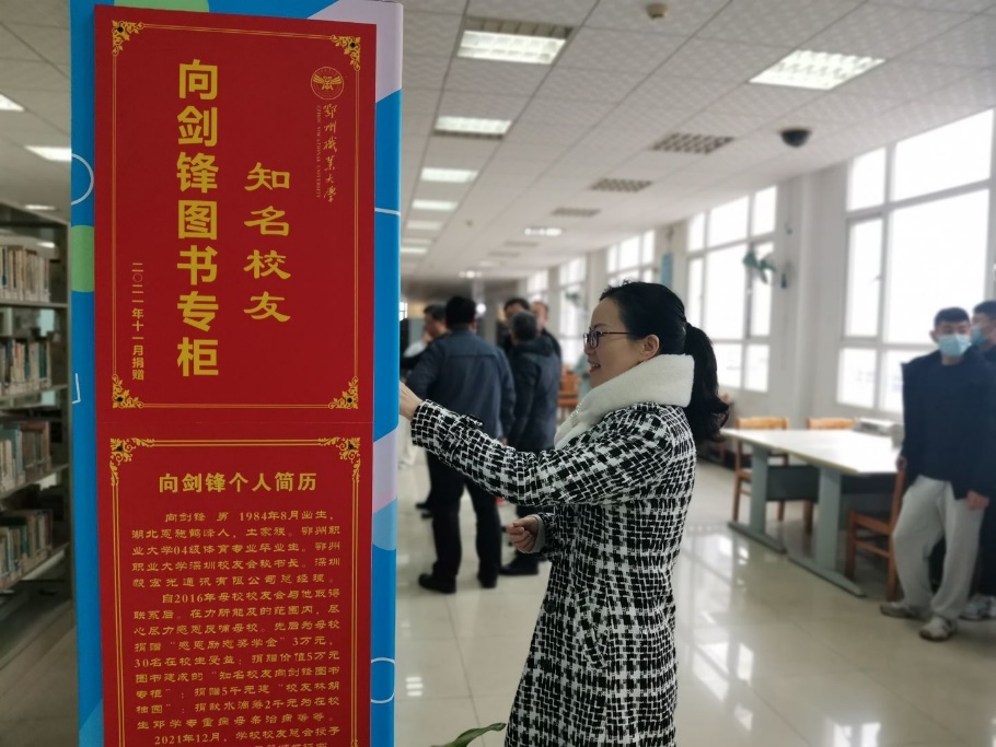 向剑锋先生系鄂州职业大学2004级体育专业校友,现为深圳毅宏光通迅有限公司总经理。向先生心系母校发展,自2016年与母校校友会取得联系后,先后为母校捐赠“感恩励志奖学金”,让30名在校生受益;捐赠“校友林胡柚园”,美化校园环境;捐赠水滴筹为在校生邓学专重病母亲治病等善举。本次又积极向学校捐赠5万余元图书,建成“知名校友向剑锋图书专柜”。向先生以各种形式支持着母校的建设和发展,不仅为学校的建设发展提供了物质帮助,也为学校发展注入了强大精神动力,对校内外师生产生积极影响。