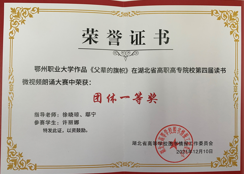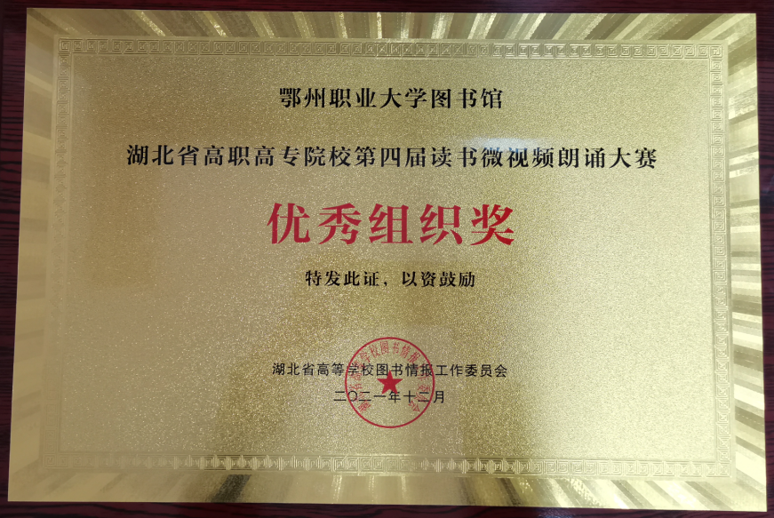 近日,鄂州职业大学图书馆组织的参赛队在湖北省高等学校图书情报工作委员会举办的“百年风雨,不忘初心,砥砺奋进” 第四届微视频朗诵大赛中,以总分第一的成绩,荣获团体一等奖和优秀组织奖。