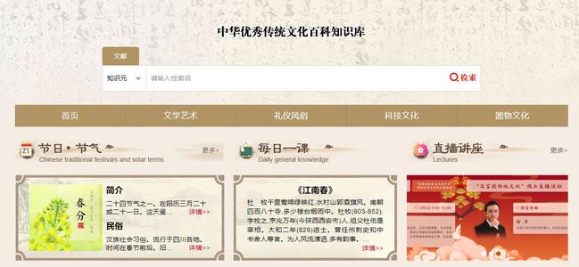 平台介绍:系统梳理了中国历史中延续传承的政治、经济、思想、艺术等各类物质和非物质的传统文化,从文学艺术、礼仪风俗、科技文化、器物文化四大方面进行了深入挖掘和深度解读,构建了26个主题文化库,内容精选自专业权威的百科释义,贴近大众生活、富有趣味性。