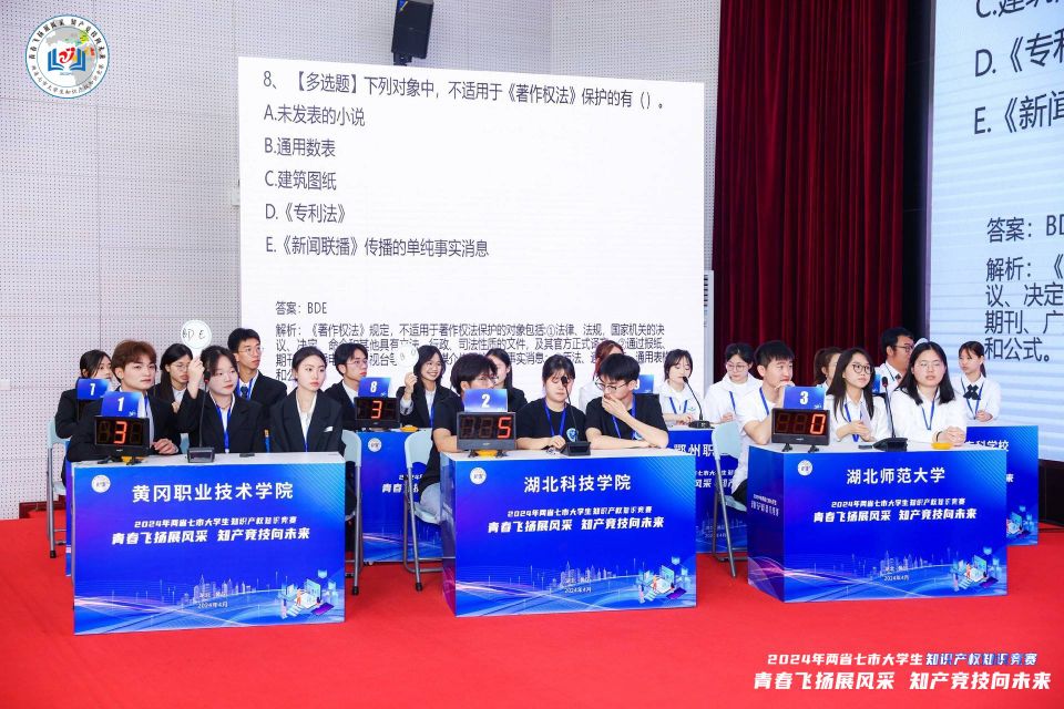 4月20日,由湖北省黄冈市、黄石市、荆州市、鄂州市、咸宁市和江西省九江市、景德镇市共同举办的2024年大学生知识产权知识竞赛在黄冈师范学院学术交流中心进行决赛。决赛现场精彩纷呈,来自两省七市14所高校代表队的队员们通过必答题、抢答题、演讲三个环节激烈角逐,赛出了水平,赛出了大学生风采。