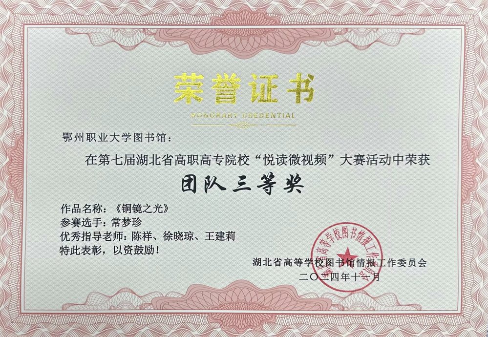 1115日,湖北省高职高专院校第七届微视频大赛落下帷幕,本次比赛以“弘扬中华优秀传统文化”为主题,全省33所高职院校的446件作品参赛,经过湖北省高等学校图书情报工作委员会高职高专分委会组织专家现场评审,我校选送的作品《铜镜之光》荣获团体三等奖,我校图书馆获得优秀组织奖。