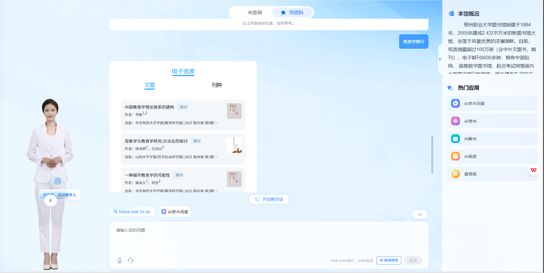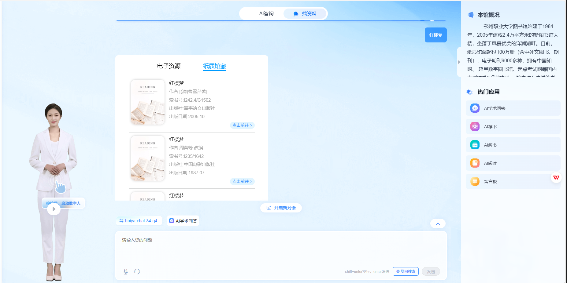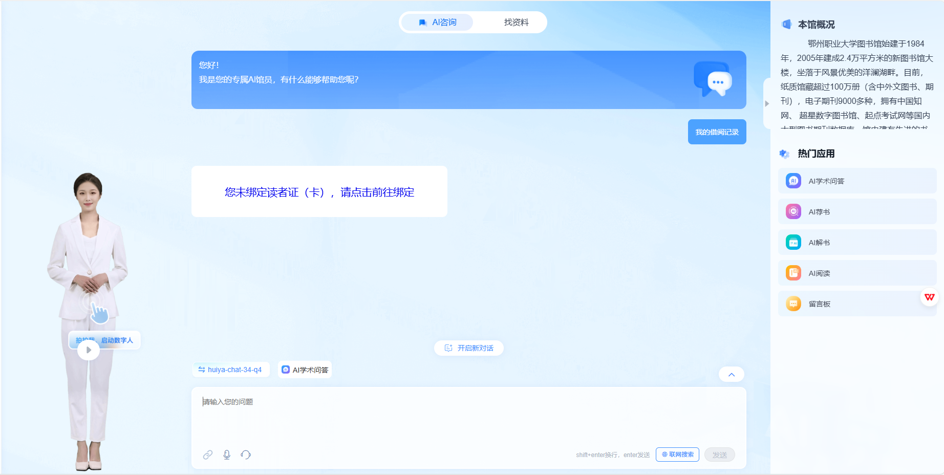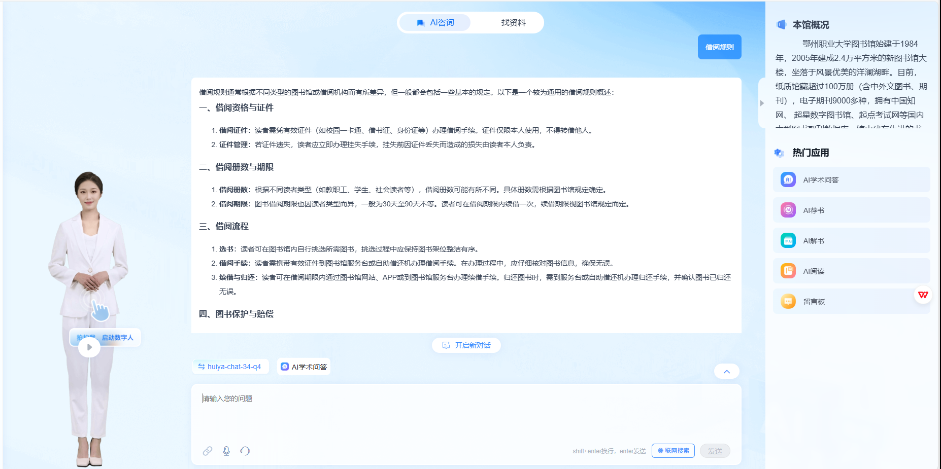 为进一步推进智慧图书馆建设,提升文献服务智能化水平,助力师生高效获取学术资源与知识支持,我校图书馆现正式开通超星AI馆员服务试用。现将相关事项通知如下: