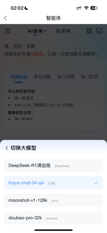 为了满足不同用户的需求,鄂州职业大学“AI馆员”现在支持多种智能模式——DeepSeek、Kimi、豆包、文心一言等。这意味着无论是深入研究还是轻松学习,您都能找到最适合的帮助方式。模式切换的方式如下: