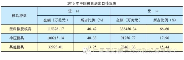 (1)按模具种类分,进出口最高的是塑料橡胶模具,分别占进出口总额的46.42% 和66.60%;其次是冲压模具,分别占进出口总额的40.33 % 和17.96%,具体如下表所示。