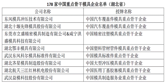 在公示名单中,湖北模具界有东风模冲等8家企业入选,如下表所示。178家中国重点骨干模具企业名单(完整版),可登陆中国模协网站 查看。