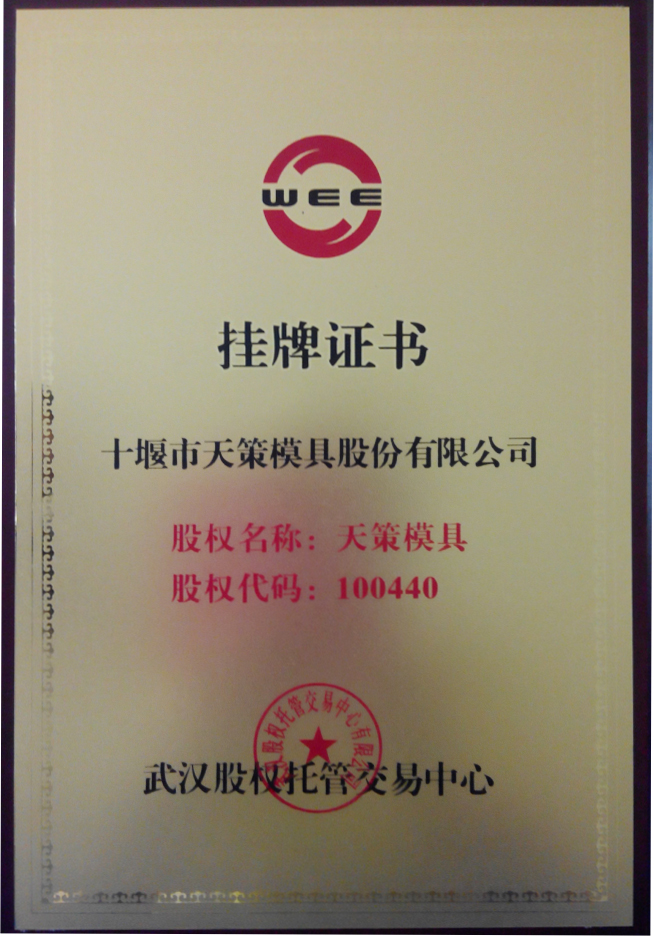 十堰市天策模具股份有限公司成立于2003年6月,主要从事汽车冲压模具设计与制造,同时也兼营汽车冲压件检具的设计和制造,以及冲压件的批量生产。十堰市天策模具股份有限公司作为一家民营企业,自创建以来,坚持“以人为本、科学发展”的方针,“重人才、重安全、重质量”为核心,被客户评为优秀供应商的荣誉称号,在一片喝彩声中不断发展不断壮大。