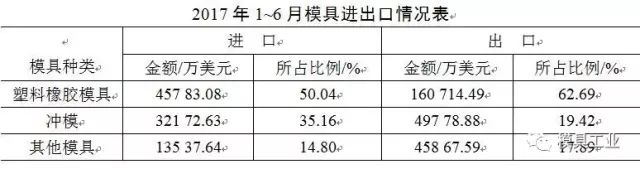 (1)按模具种类分,塑料橡胶模具进、出口额占比为50.04%和62.69%;冲模为35.16%和19.42%,如下表所示。