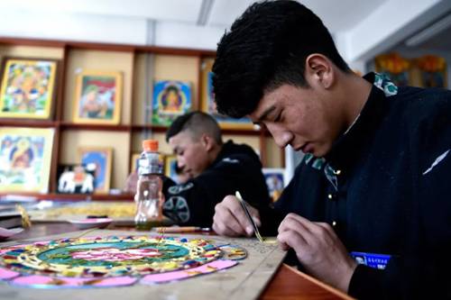 青海省海南藏族自治州职业技术学校学生在课堂上制作掐丝唐卡。新华社记者张龙摄