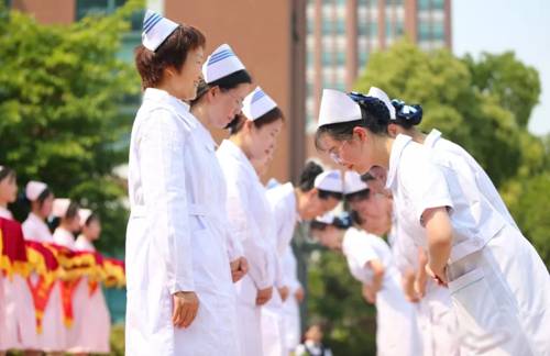 江苏省南通卫生高等职业技术学校的老师为学生带上护士帽后,学生向老师致敬。新华社发徐培钦 摄