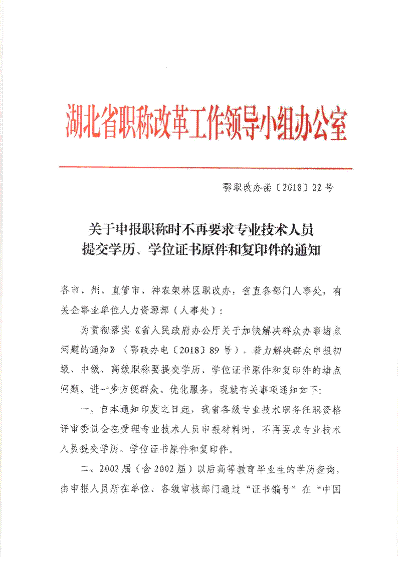 关于申报职称时不再要求专业技术人员提交学历、学位证书原件和复印件的通知