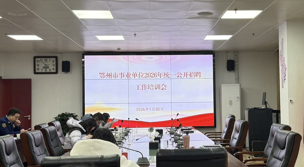 为顺利推进鄂州职业大学2026年事业单位公开招聘工作,2026年1月30日,学校人事处参加鄂州市事业单位2026年统一公开招聘工作培训会议。此次会议由鄂州市人社局组织,市人社局事业党组成员、副局长叶卫平作重要讲话,全市28家主管部门参会。