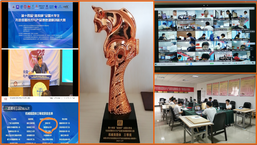 2021年4月至7月,经学院研究决定,由机械设计与制造专业牵头、以机械制图课程组教师为核心,组织智能制造专业群下属几个专业的学生,开展了以进军第十四届“高教杯”全国大学生先进成图技术与产品信息建模创新大赛为目标的集体培训、训练、模拟比赛、校赛、省赛,备赛师生经历了 “白加黑、七加二”的无数个日夜战鏖战,终于获得了机械类团体三等奖,个人全能二等奖一个,三等奖两个。湖北省有近20所高职院校进军国赛,仅有2所高职院校获奖(均为三等奖)。