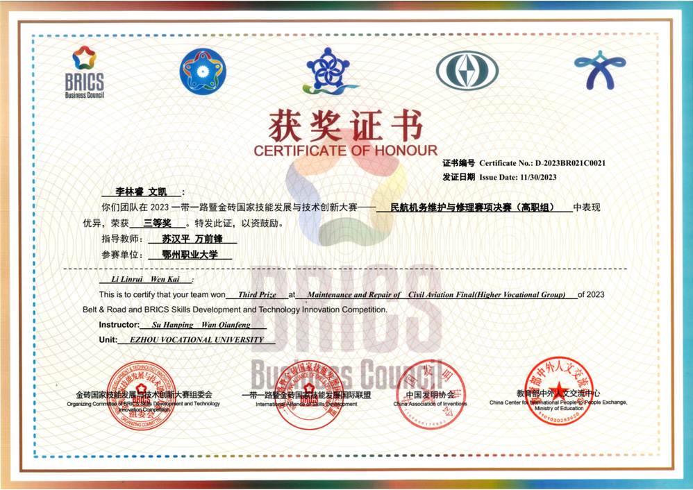 (通讯员 苏汉平)202312月,由金砖国家工商理事会中方理事会、“一带一路”暨金砖国家技能发展国际联盟、中国科协“一带一路”暨金砖国家技能发展与技术创新培训中心、中国发明协会、教育部中外人文交流中心组织的“2023一带一路暨金砖国家技能发展与技术创新大赛——民航机务维护与修理赛项”全国决赛在武昌职业学院举行。来自全国58支参赛队伍共116名选手展开了激烈角逐。