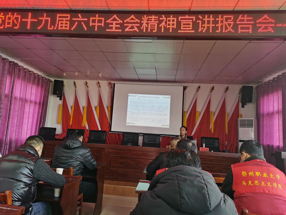 (通讯员 宋其湖)1月19日,鄂州职业大学思政课部直属支部书记、主任宋其湖同志带队,组织思想道德与法治教研室副教授罗家清及心理健康教育教研室主任桂捷,教师何莉、张柳,深入太和镇农科村,开展十九届六中全会精神宣讲、走访看望农户及心理健康宣传服务活动。