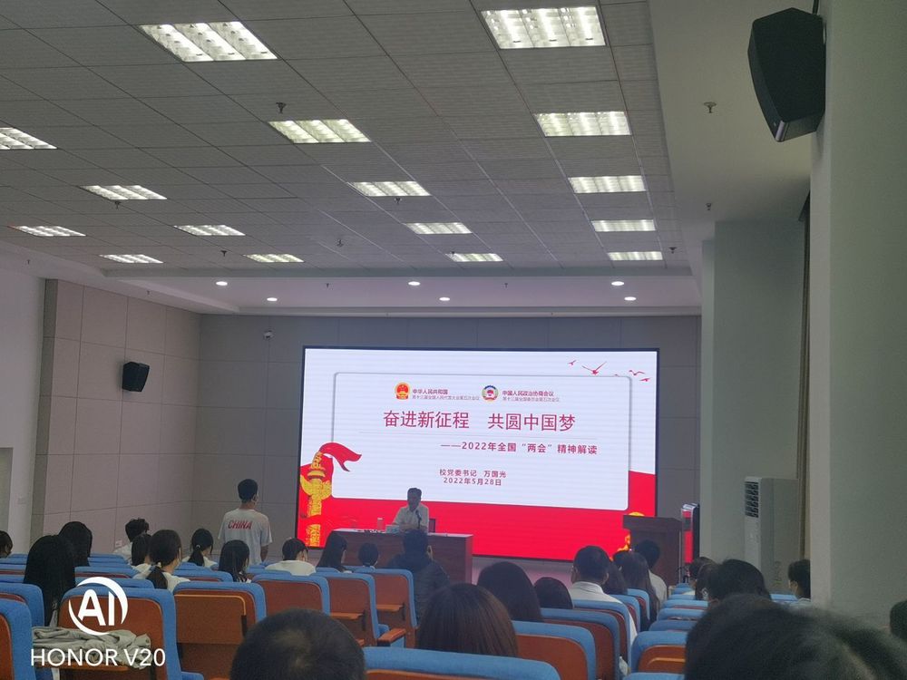 随后,万国光书记从2022年全国“两会”会议概况、2022年《政府工作报告》解读、2022年全国“两会”热词解读等三方面给师生上了一堂生动的专题思政课。授课过程中,万书记以提问的形式激发学生积极思考,利用现实中的生动案例及学生身边的故事分析问题,引导师生深刻地领会了今年两会的思想精髓。