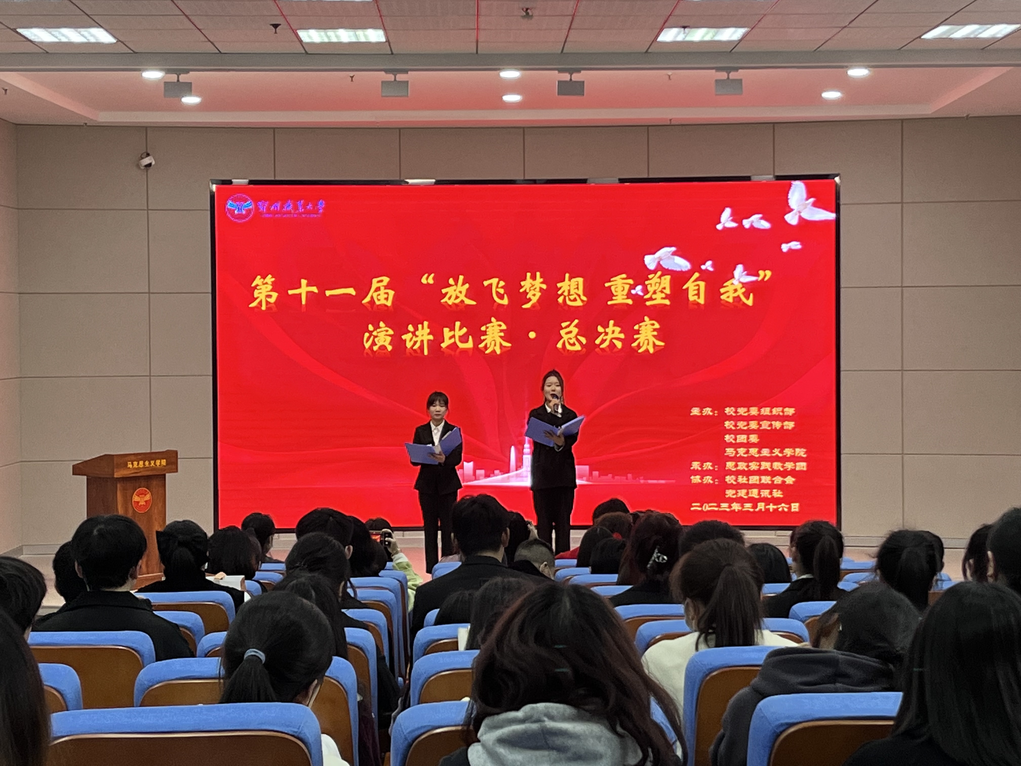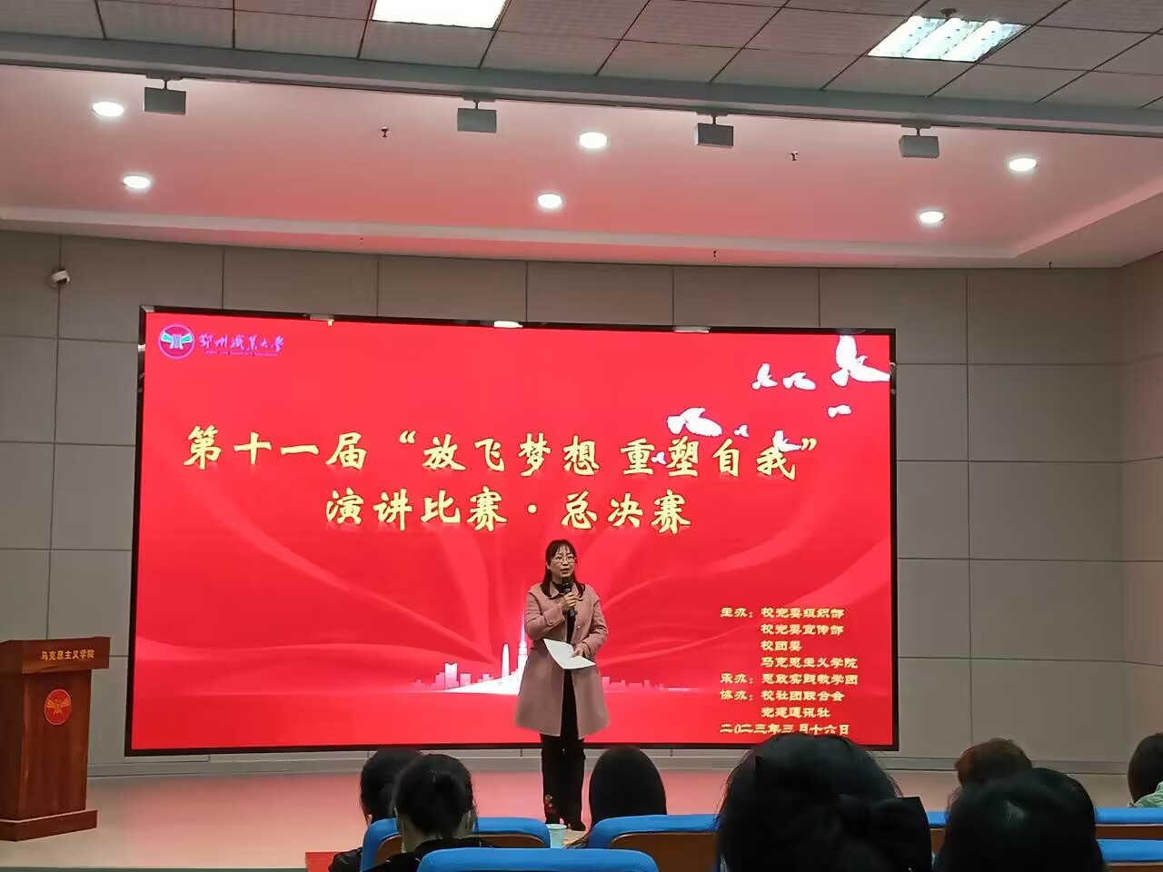 3月16日下午,鄂州职业大学党委组织部、党委宣传部、校团委、马克思主义学院联合主办、思政实践教学团承办的第十一届“放飞梦想·重塑自我”演讲比赛总决赛在五号教学楼W102多媒体教室成功举办。此次活动邀请了主办方部分老师担任比赛评委,马克思主义学院教师和思政实践教学团学生前往现场观看比赛。