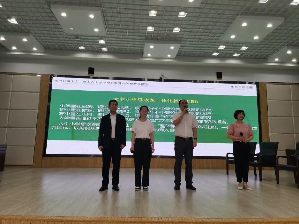 思政课是伴随青少年成长发展全过程,贯穿大中小学教育全过程的一门关键课程。5月18日,华中师范大学马克思主义学院与鄂州市教育局联合举办的首场大中小学思政课一体化教学展示活动在鄂州高中举行。来自鄂州市实验小学、汀祖中学、鄂州市第二中学、华中师范大学马克思主义学院的4名骨干思政课教师,围绕“生态文明建设”主题进行授课。马克思主义学院吴寒梅副院长、柯雁主任、杨秋凤等十名教师参与了此次活动。