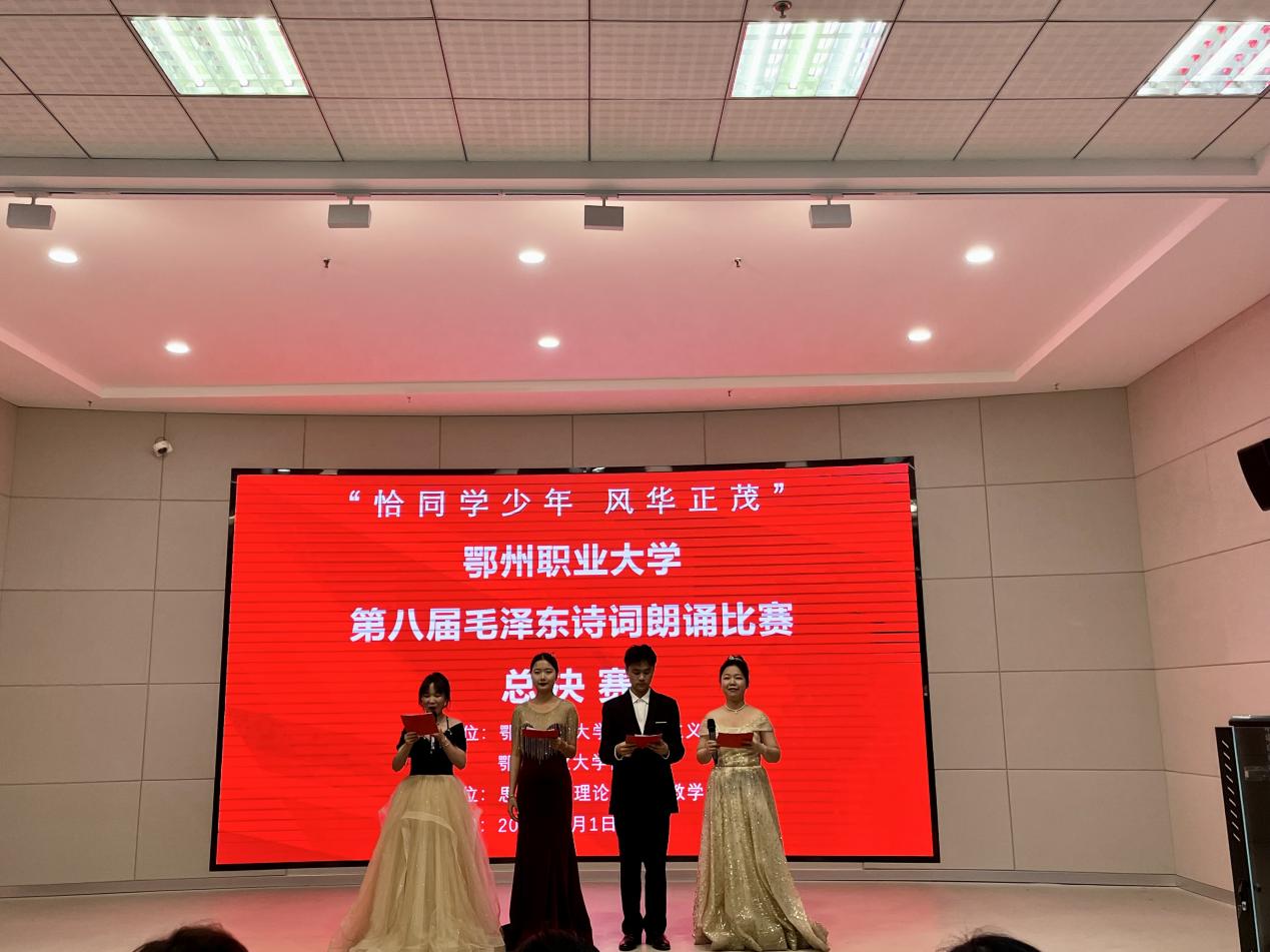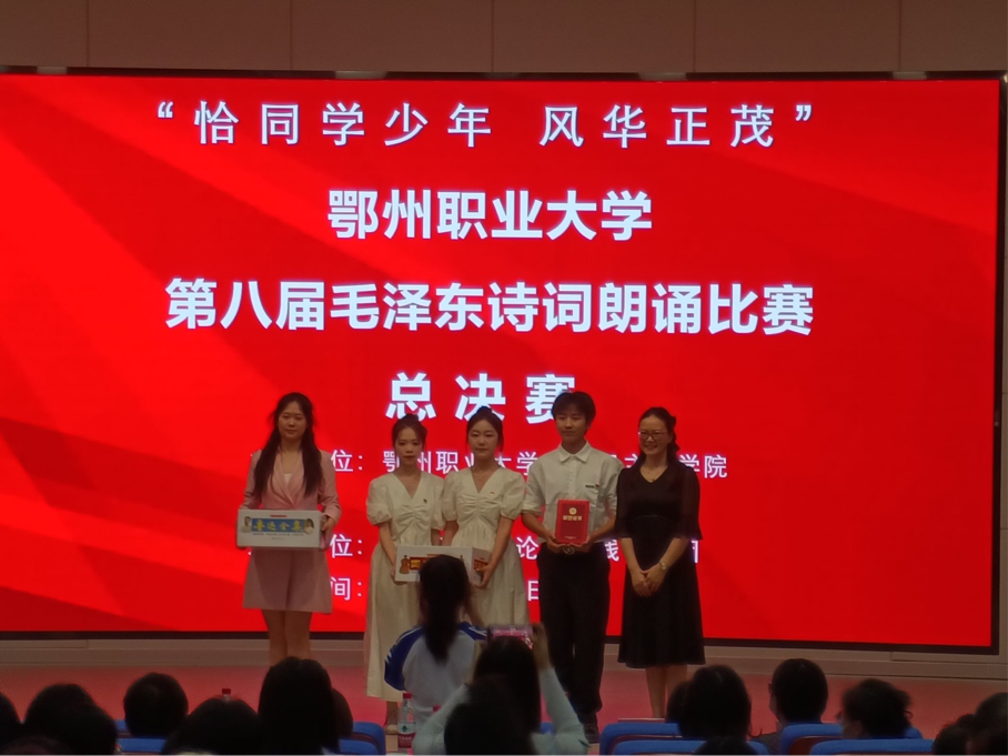 “恰同学少年,风华正茂;书生意气,挥斥方遒。”为进一步发挥思想政治理论课在高校思想政治教育工作中的主渠道、主阵地作用,传承红色基因,赓续红色血脉,增进大学生对毛泽东诗词的认识和了解,帮助大学生树立爱国志和报国情,6月1日下午,鄂州职业大学第八届毛泽东诗词朗诵比赛总决赛在五号教学楼一楼W102多功能厅圆满落幕。