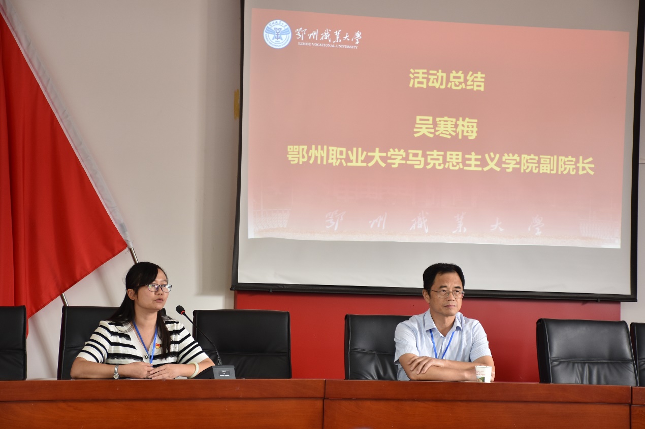 最后,马克思主义学院副院长吴寒梅针对为期两天的研修进行了活动总结,她指出,学院为本次研修活动做了精心筹备,活动能成功举办要感谢临空区社会事务局及中小学、鄂州中等专业学校参会教师的大力支持,为期两天研修活动的结束不是终点而是新的起点,为进一步针对大中小学思政课一体化共同体建设存在的困惑与问题加强校际交流开头起步、奠定基础,同时欢迎各校老师到本校思政教学实践基地参观交流。