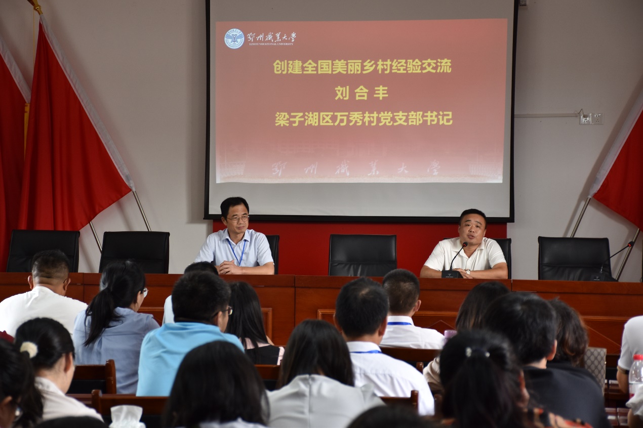 在万秀村,老师们参观了村容村貌后在党群活动中心聆听了万秀村党支部书记刘台丰对于万秀村创建全国美丽乡村的情况介绍,了解了万秀美丽乡村建设规划与发展历程。刘台丰书记讲到,曾经万秀村的村民除了种地,只有外出打工谋生,而近年来,万秀村人居环境改造、美丽乡村建设如火如荼,处处都是机会,远走他乡的村民陆续返乡创业,成为农家乐老板。其中,最励志的创业故事是80后村民刘俊返乡创业,开办农家乐和民宿,如今他已是赫赫有名的黄金甲民宿的总经理。