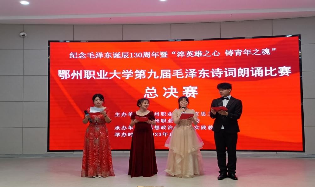 在毛泽东同志诞辰130周年来临之际,为激励本校师生从感悟伟人经典诗词中传承红色精神,赓续红色薪火,汲取新时代前行的力量,12月7日下午,鄂州职业大学第九届毛泽东诗词朗诵比赛总决赛在五号教学楼W102多功能厅拉开帷幕。