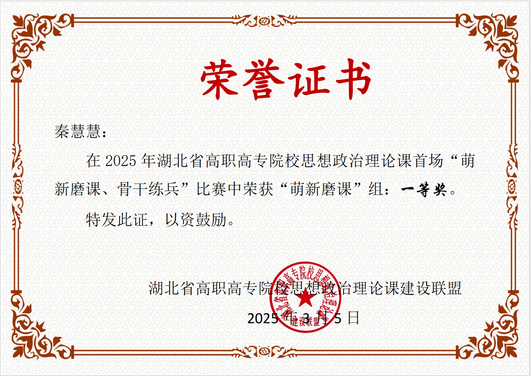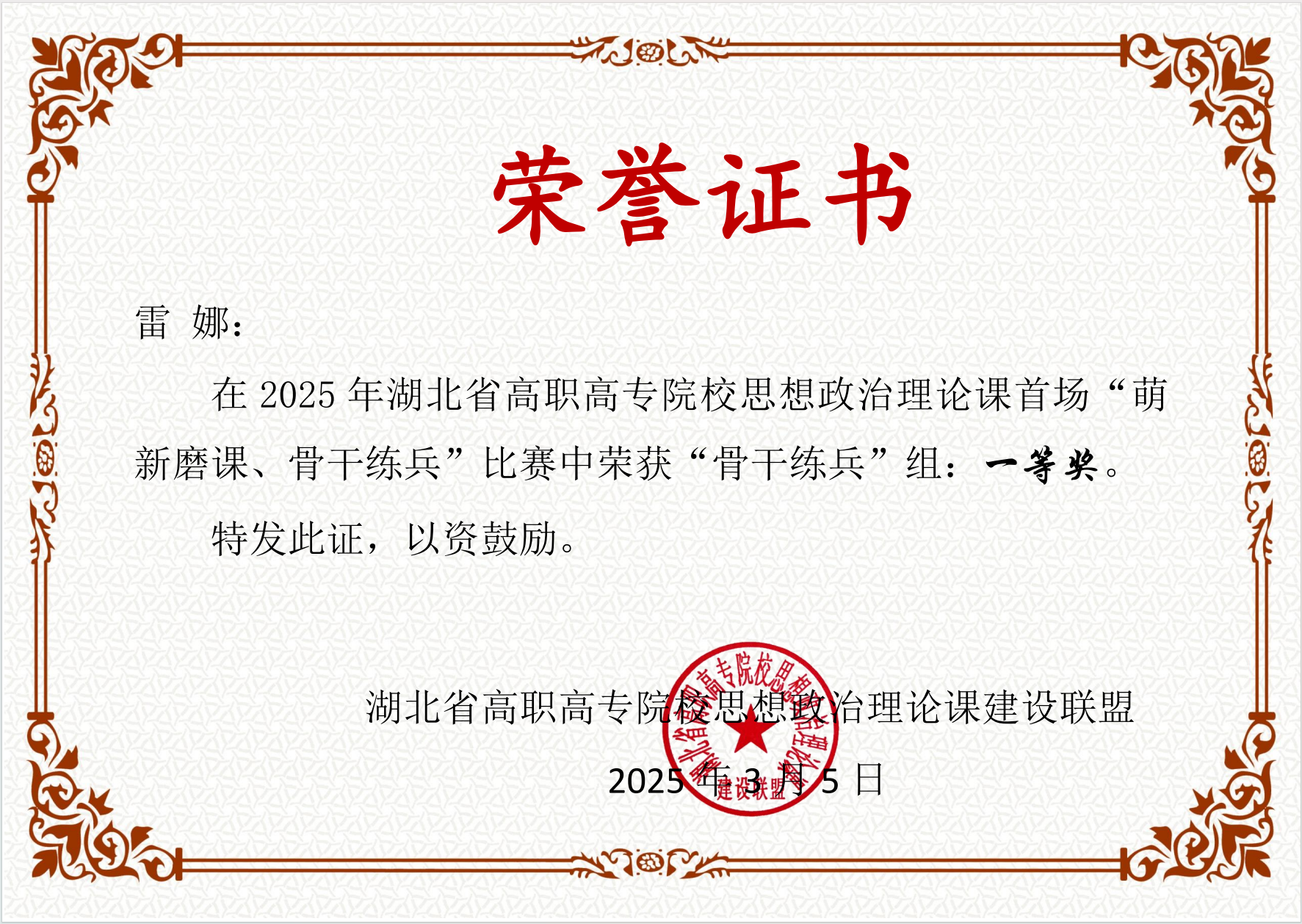 近日,湖北省高职高专院校思想政治理论课建设联盟公布了2025年首场“萌新磨课、骨干练兵”比赛的获奖结果。鄂州职业大学马克思主义学院教师在此次比赛中斩获佳绩,雷娜老师荣获“骨干练兵”一等奖,秦慧慧老师荣获“萌新磨课”一等奖。