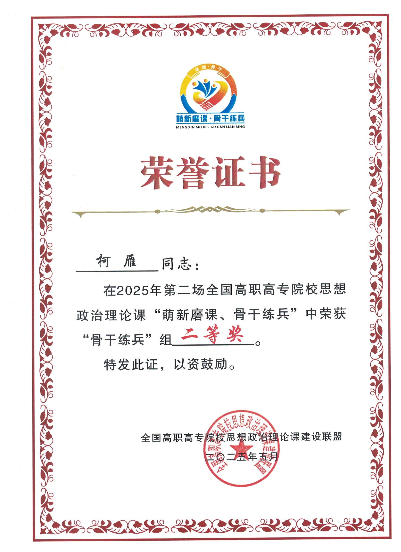 近日, 2025年第二场全国高职高专院校思想政治理论课“萌新磨课、骨干练兵”教学展示活动圆满落幕,我校马克思主义学院柯雁老师荣获二等奖。