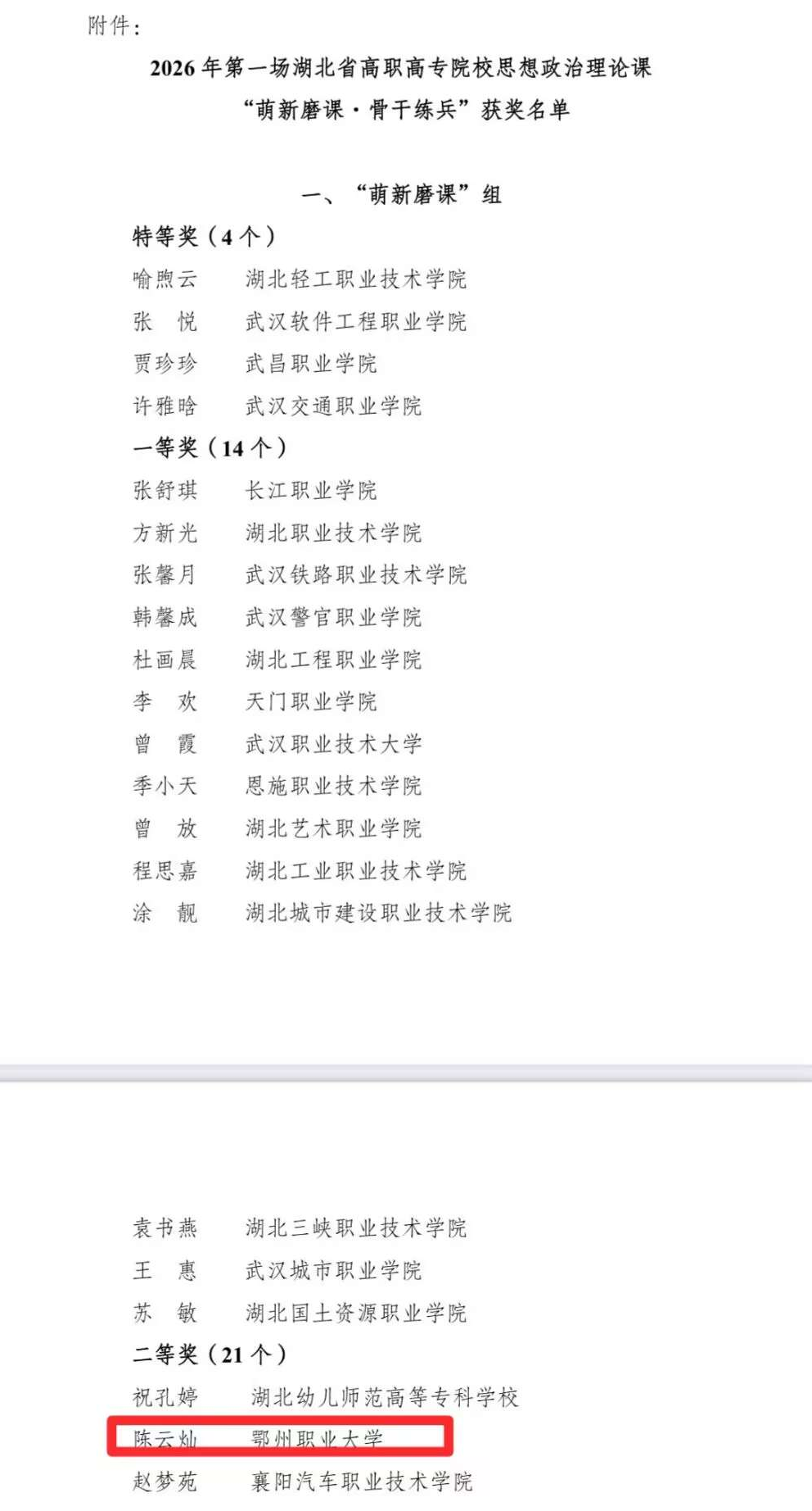 近日,由湖北省高职高专院校思想政治理论课建设联盟主办的2026年第一场思政课“萌新磨课、骨干练兵”教学展示与交流活动圆满落幕。我院教师陈云灿凭借扎实的理论功底、创新的教学设计,荣获“萌新磨课”组二等奖。