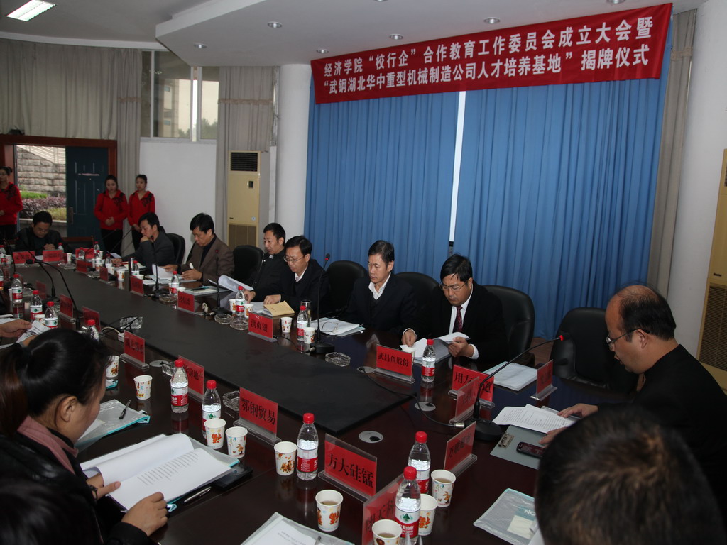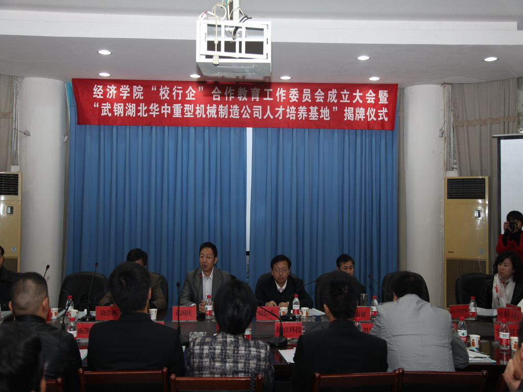 2012年11月16日上午,鄂州职业大学经济学院在校学术报告厅隆重举行“校行企”合作教育工作委员会成立大会暨“武钢湖北华中重型机械制造有限公司人才培养基地”揭牌仪式。