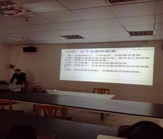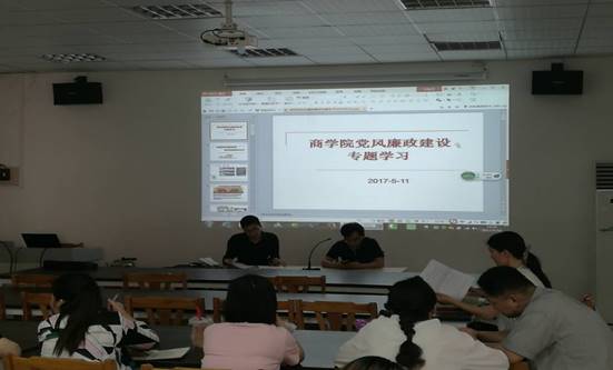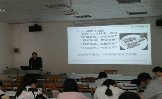 5月18日下午,商学院党总支书记方明亮在3号教学楼一楼电商实训室围绕我校党风廉政建设宣教月活动主题“贯彻六中全会精神,推进全面从严治党”,给全院党员、教职工带来主题为《加强党风廉政建设 提高师德师风水平》廉政党课。