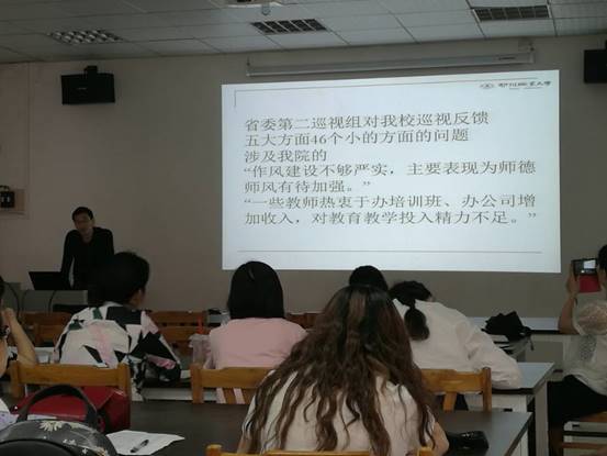 方明亮教授从党风廉政建设的形势以及党的十八届六中全会重要精神着手,介绍了推进全面从严治党新要求,结合实际案例和省委巡视组对我校巡视反馈意见,分析了学院师德师风现状和突出表现,要求全院教师要树立正确的权力观和利益观,坚守道德高线,严守纪律底线,强化教书育人、为人师表、终生学习理念和行动,通过党风廉政建设宣教月活动,查摆是否存在“重教书轻育人”、“不爱岗不敬业,从事第二职业的行为”、“接受学生、家长财物,以教谋私”、“不健康不正常的师生关系”、“违背学术规范,侵占他人劳动成果”等问题,自查自纠,营造良好院风。