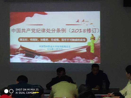 随后,学院全体党员集中学习了新修订的《中国共产党纪律处分条例》,院党总支号召党员干部和全院党员为进一步推进学院三风建设工作带好头,为学院建设和新发展多做贡献。