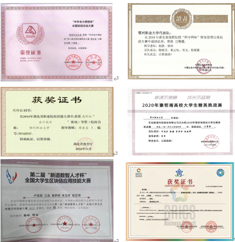 2021年湖北省高职会计职业技能大赛三等奖、网中网杯财务共享专业技能大赛二等奖、新道杯全国财务大数据比赛三等奖、科云杯财务管理技能大赛二等奖等。