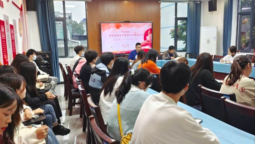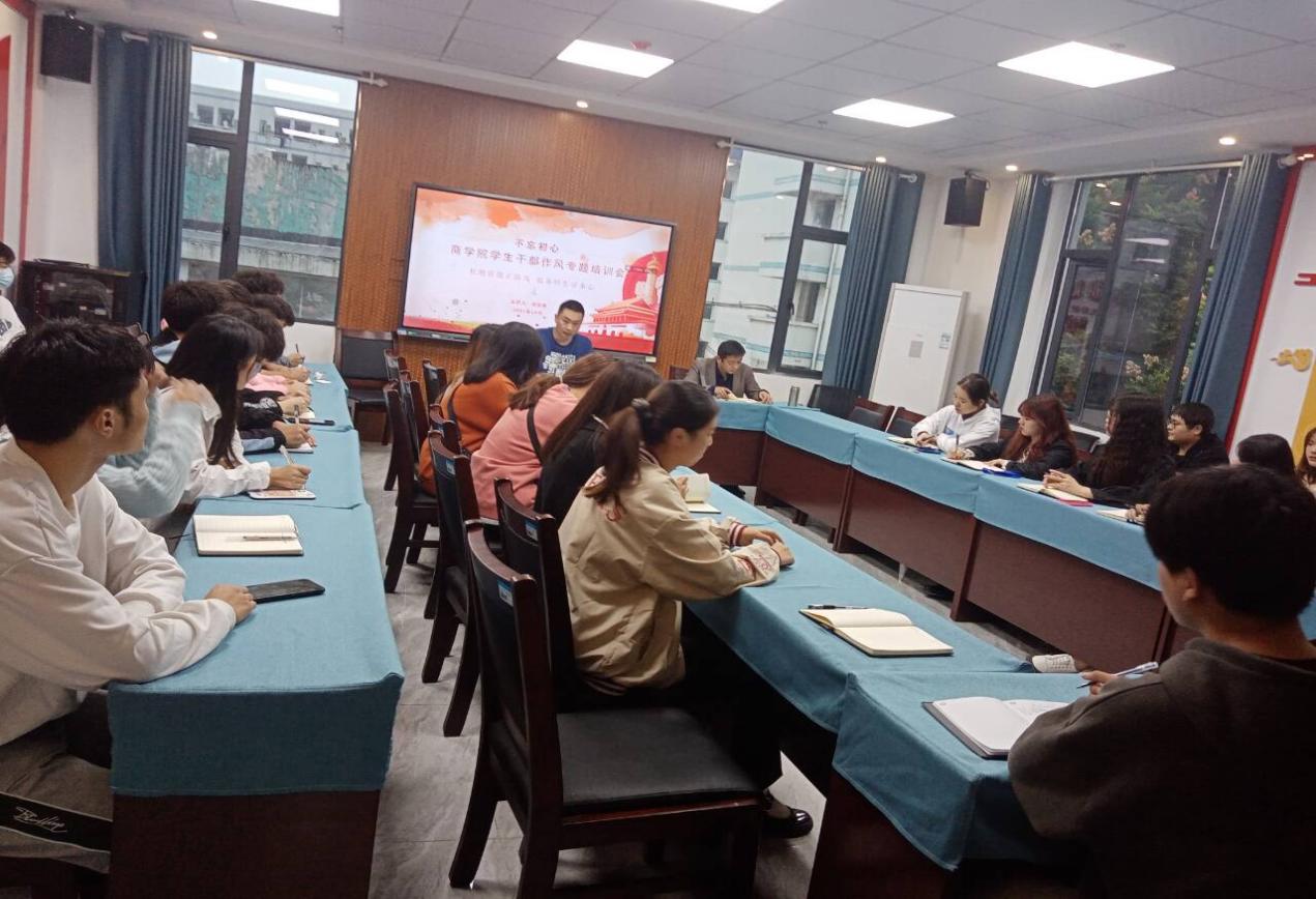 20211029日星期五下午4点整,商学院学生干部作风专题培训会议于智慧物流三楼会议室召开。此次会议由团总支书记洪全洲主持,党总支书记徐宏伟及学院30余名主要学生干部参加
