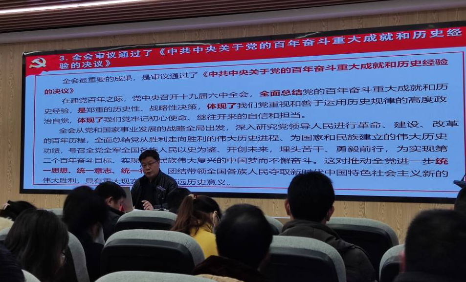 胡海平同志介绍十九届六全会是一次载入中华民族伟大复兴辉煌史册的重要会议,是在中国共产党成立一百周年的重要历史时刻,在党和人民胜利实现第一个百年奋斗目标、全面建成小康社会,正在向全面建成社会主义现代化强国第二个百年奋斗目标迈进的重大历史关头胜利召开的。全会高度评价十九届五中全会以来中央政治局的工作,审议通过了《关于召开党的第二十次全国代表大会的决议》《中共中央关于党的百年奋斗重大成就和历史经验的决议》。胡海平同志从《决议》的时代背景、坚持唯物史观和正确党史观、一个根本问题与四个时期、党百年奋斗的历史意义和基本经验、新时代的要求、党中央号召等七个方面重点解读《中共中央关于党的百年奋斗重大成就和历史经验的决议》。