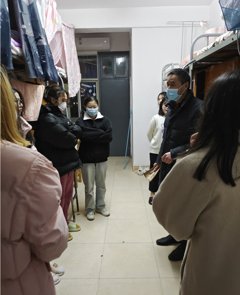 走访中,院领导与同学们亲切交谈,询问同学们寒假生活情况和返校情况,关心学生思想和心理动态,向同学宣讲疫情防控工作的重要性,鼓励同学们及时接种第三针疫苗,叮嘱同学们严格遵守学校疫情防控要求,非必要不外出,坚持戴口罩、勤洗手、常通风,持续做好个人防护,坚持“一日三测”,做好寝室卫生。