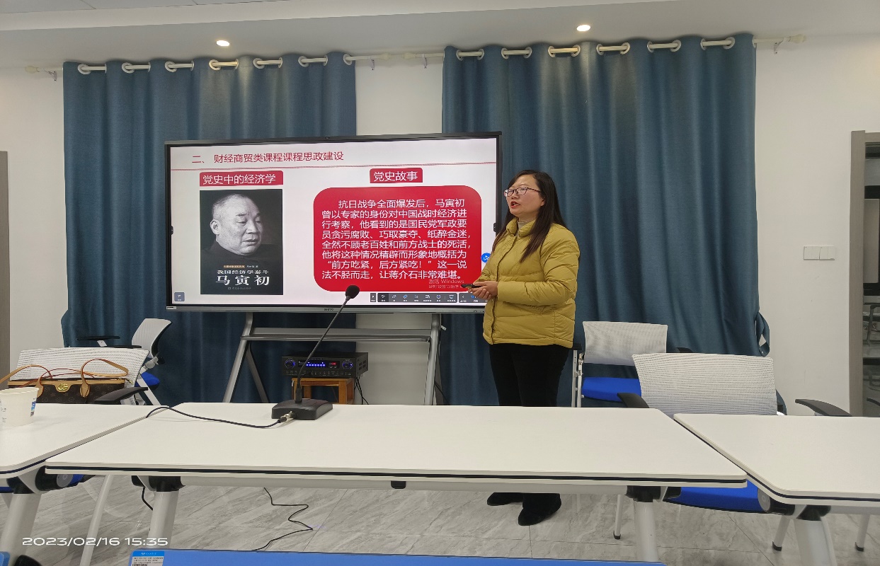 吴老师介绍了课程思政建设的意义,并以马寅初先生党史中的经济学为例,系统并生动地介绍财经商贸类课程如何挖掘思政元素,她强调坚决防止“贴标签”、“两张皮”。通过马寅初先生“经世济民”的案例,为教师们剖析了如何避免生硬地讲解家国情怀,达到润物无声的育人效果。
